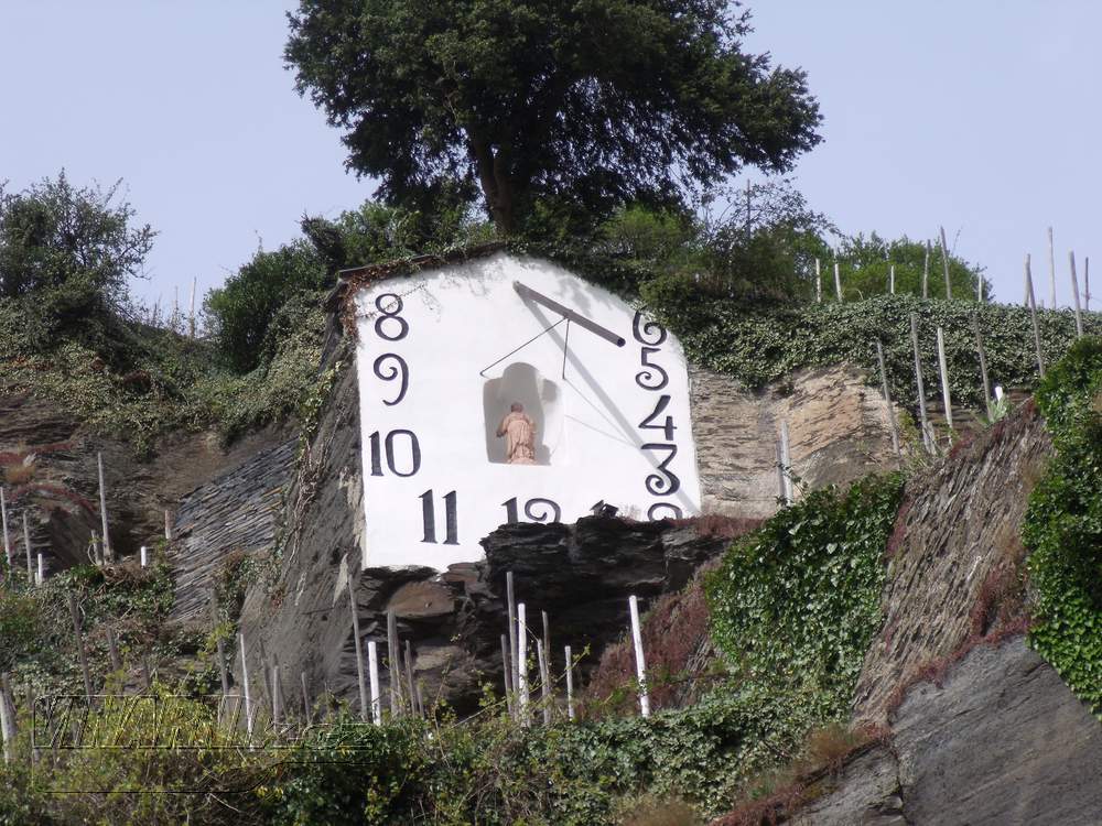 První stoupání jsme podnikli nad vesnicí Wehlen do viniční trati Wehlener Sonnenuhr. Abychom si trochu vysvětlili ten název, či obecně označování viničních tratí, na kterých se zdejší ryzlinky pěstují... Zpravidla se název skládá nejprve z názvu obce, ke které vinice příšluší, a to přídavným jménem na začátku názvu. Takže název vinice nad Wehlenem začíná přívlastkem Wehlener. A Sonnenuhr - to jsou sluneční hodiny. Zajímalo nás, proč zrovna tohle. Určitou nápovědou byly skutečné sluneční hodiny vymalované na skále vysoko ve vinici. Ale to je spíš symbol, podstata je hlubší. Tyto sluneční hodiny měří hroznům unikátně dlouhý čas slunečního svitu, který mají díky skvělé poloze každý slunný den vyměřený. Pálí to sem od rána od osmi hodin nepřetržitě až do večera do šesti.