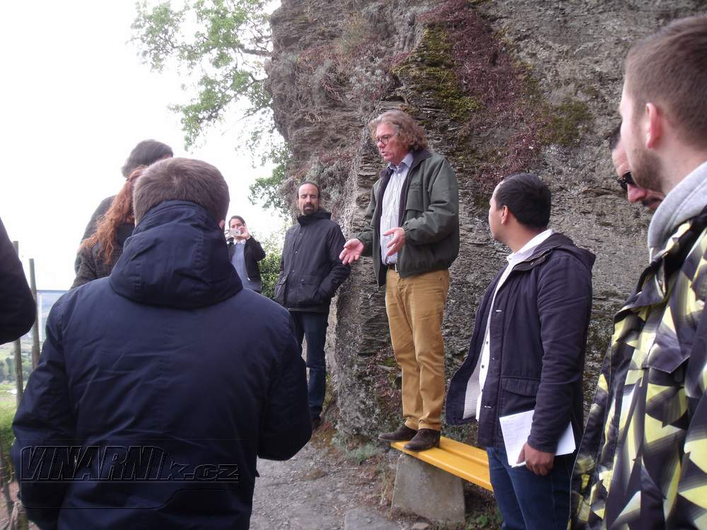 Nejdobrodružnější výstup nás čekal do vinice Ürziger Würzgarten, která stojí se svým minerálním vulkanickým podložím za víny s velmi kořenitým a možná až trochu exotickým charakterem. A co na tom bylo dobrodružné? Především neskutečná prudkost tohoto kopce a ještě neskutečnější útlostí cestiček, kterými náš landrover stoupal. A když se Ernie Loosen na samém konci cesty na miniaturním plácku doslova vykousaném ve skále rozhodl, že tohle auto otočí, uvažoval jsem, že skočím dolů dobrovolně a hrdině zemřu na jedné z terásek mezi révou, kde budu ležet dlouho, minimálně do nejbližší sklizně, protože nikomu se nebude chtít spouštět se pro mé ostatky...